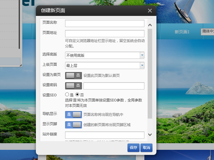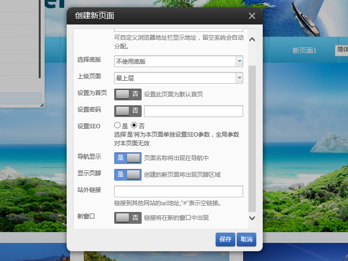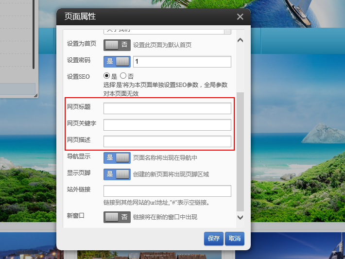 “站外鏈接”:在此處輸入鏈接地址后, 則會(huì)在導(dǎo)航欄上建立一個(gè)鏈接, 當(dāng)你點(diǎn)擊時(shí)則會(huì)跳轉(zhuǎn)到這個(gè)鏈接地址。如果在空格位置填上“#”,則該頁面名稱在導(dǎo)航條上無法點(diǎn)選,一般這個(gè)會(huì)使用在:當(dāng)前頁面下有子頁面,希望方可直接點(diǎn)擊打開子頁面的情況。 “新窗口”:是指當(dāng)點(diǎn)擊導(dǎo)航欄上鏈接時(shí), 是否新打開一個(gè)窗口顯示頁面內(nèi)容。