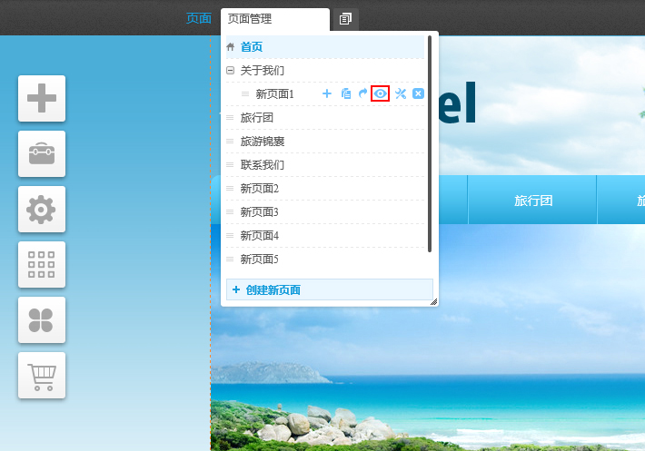 我們可以在編輯頁面左上角看到網(wǎng)站的所有頁面,鼠標(biāo)指向某個(gè)頁面名稱時(shí),可以見到這些按鈕, 如下圖所示: 其中紅色區(qū)域?yàn)轫撁婀芾淼幕竟δ馨粹o.下圖中紅色方框中按鈕功能是在該頁下添加一個(gè)子頁面, 比如我們?cè)凇笆醉摗毕绿砑印皟?yōu)惠促銷”這個(gè)子頁面.