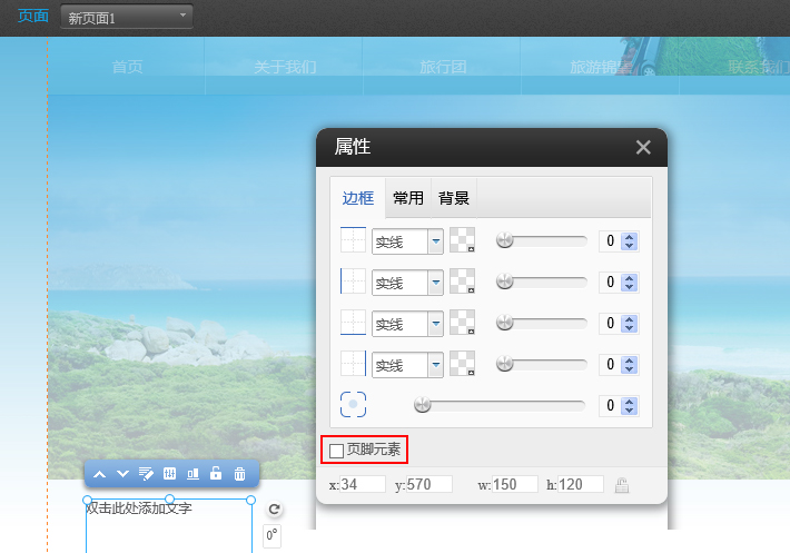 “顯示頁腳”:頁腳一般是指網(wǎng)站的最底部的信息, 比如公司名稱、版權(quán)聲明、聯(lián)系電話、地址等等. 當(dāng)頁面選擇顯示頁腳后, 在該頁面最底部就會(huì)出現(xiàn)一個(gè)灰色的內(nèi)容框, 您可以在此處編輯頁腳. 需要注意的是往頁腳里添動(dòng)模塊時(shí), 需要勾選模塊屬性里的“底部元素”, 然后才能將模塊拖進(jìn)頁腳區(qū), 如下圖: