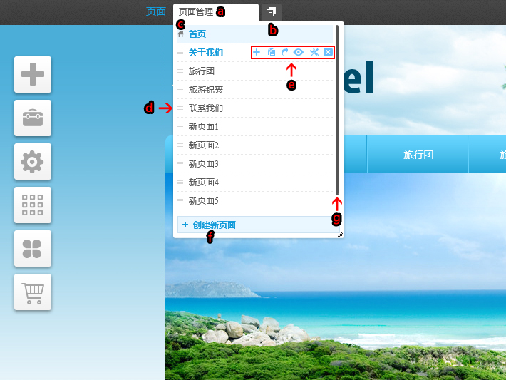 b. 刪除原有的頁面再新建所需要的頁面,并自行添加所需的頁面內(nèi)容,如:導(dǎo)航條、文字模塊、圖片模塊、會(huì)員模塊等等并按自己的想法進(jìn)行布局和設(shè)計(jì)。 4.頁面管理的常用按鍵: