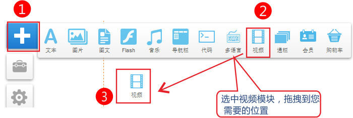 1.依次點擊 添加按鈕-》視頻。選中模塊拖拽到您需要的位置。