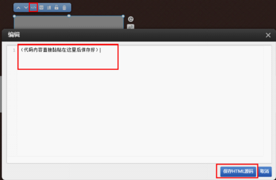 第二步:拖動模塊到頁面會彈出一個粘貼代碼的窗口,如下圖所示: