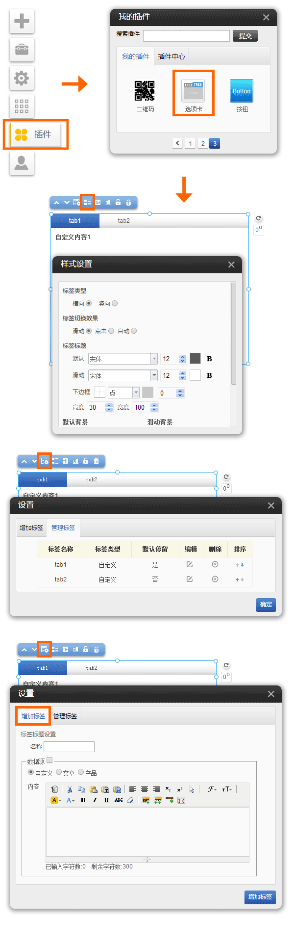 使用方法:進入網站編輯-〉點左側插件圖標-〉插件中心,找到選項卡圖標,點啟用