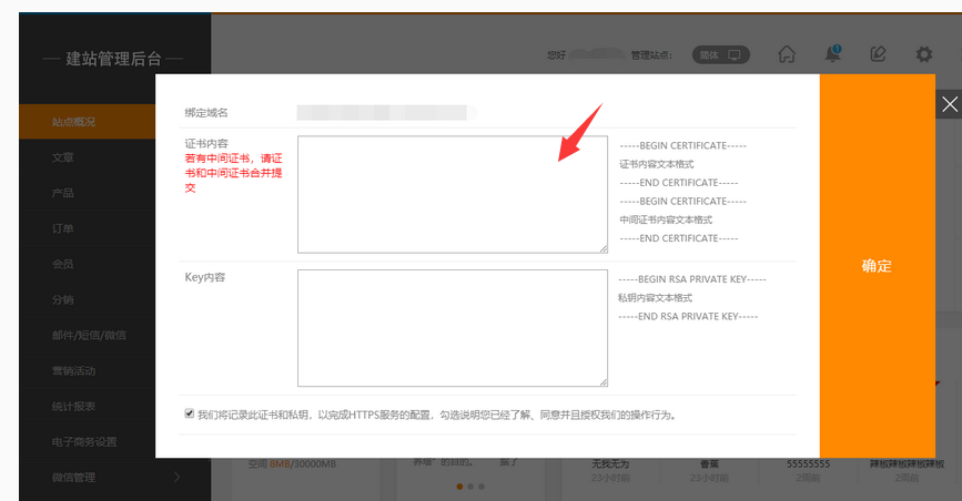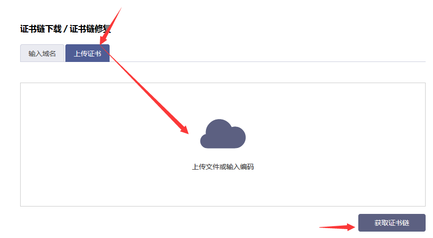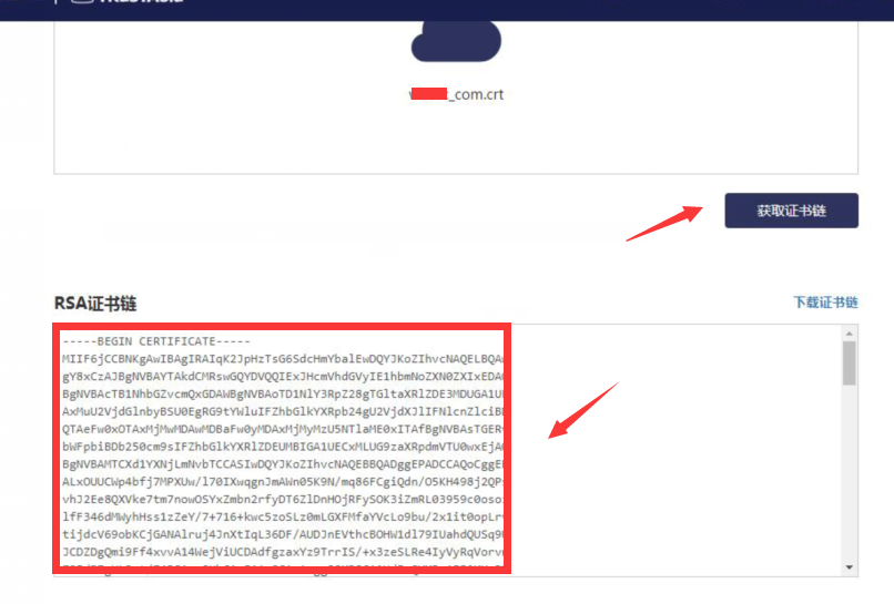 將域名命名的那個crt文件證書放入上        傳證書中,然后獲取證書鏈,將整個獲取的證書鏈內(nèi)容作為 證書內(nèi)容寫入。