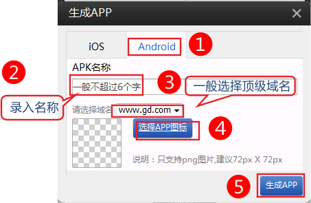 1.在線生成APP,可以自己填寫項(xiàng)目名和android的ico圖標(biāo)。