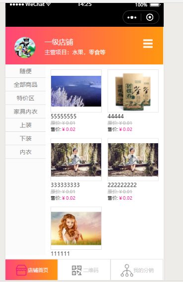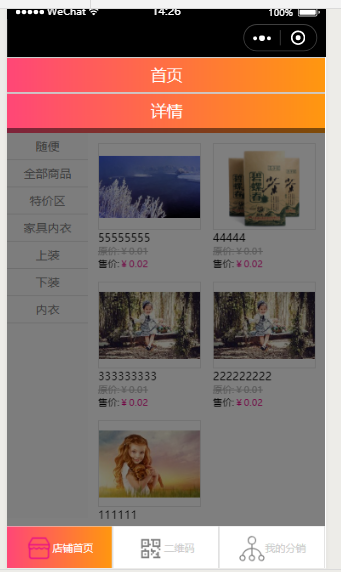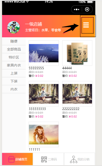 3.若需要返回到此小程序的任意頁面時,點擊分銷店鋪的導(dǎo)航欄即可,如圖所示: