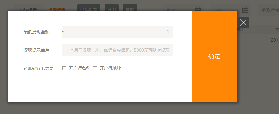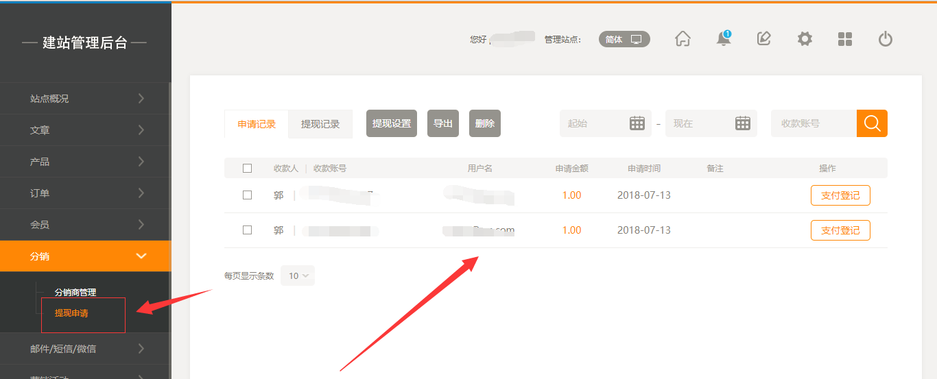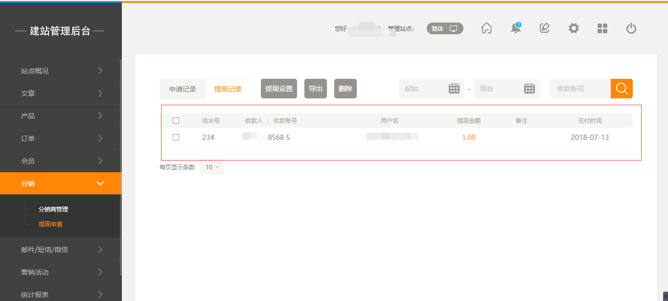 6.當(dāng)用戶在前臺提交提現(xiàn)時,在后臺的“提現(xiàn)申請”中可以看見該申請記錄,如圖所示: