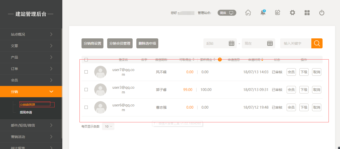 1.點擊“后臺管理”-“添加商品”選擇分銷,添加完畢之后每點擊保存,點擊“分銷”-“分銷商管理”進行設(shè)置,點擊保存,在“分銷商管理”中可以看到申請分銷的用戶,如圖所示: