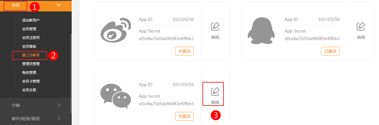 1、依次點(diǎn)擊 后臺(tái)-》會(huì)員管理->第三方帳號(hào)-》編輯