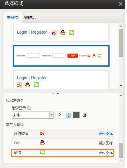 四種會(huì)員登錄樣式均支持微信登錄,同時(shí)可以修改微信登錄圖標(biāo)
