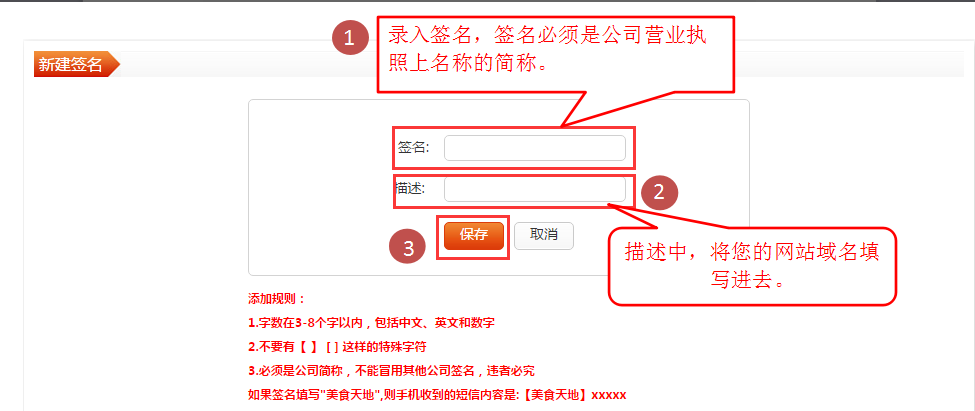 依次點(diǎn)擊短信群發(fā)平臺(tái)模板簽名-》新建短信簽名(注意簽名必須是公司營(yíng)業(yè)執(zhí)照上名稱的簡(jiǎn)稱,不能寫網(wǎng)站或者自己取的其他簡(jiǎn)稱,建議只設(shè)置一個(gè)簽名)