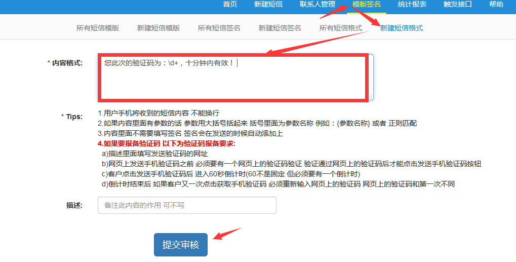 2. 還需要在短信管理平臺(tái)添加短信格式,通過審核后就可以在網(wǎng)站使用短信功能。