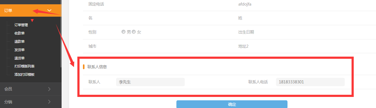 3、管理員可以通過(guò)訂單中記錄的 聯(lián)系人 、電話、及訂單編號(hào)核實(shí)提貨人信息