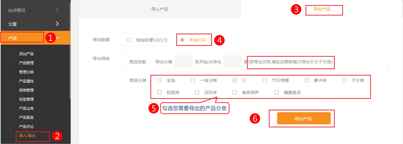 依次點(diǎn)擊 后臺(tái)管理-產(chǎn)品管理 -導(dǎo)入/導(dǎo)出-》導(dǎo)出-》本站csv,選擇需要編輯的商品分類3C,點(diǎn)擊 導(dǎo)出,選擇CSV文件并下載
