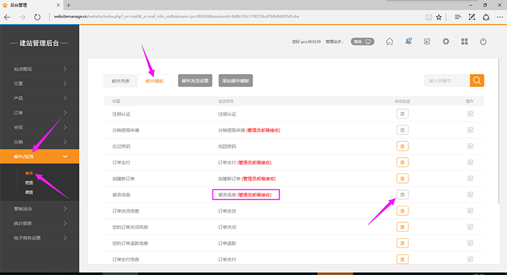 3.郵件/短信->郵件->郵件模板->留言信息,自動發(fā)送,更改為:“否”