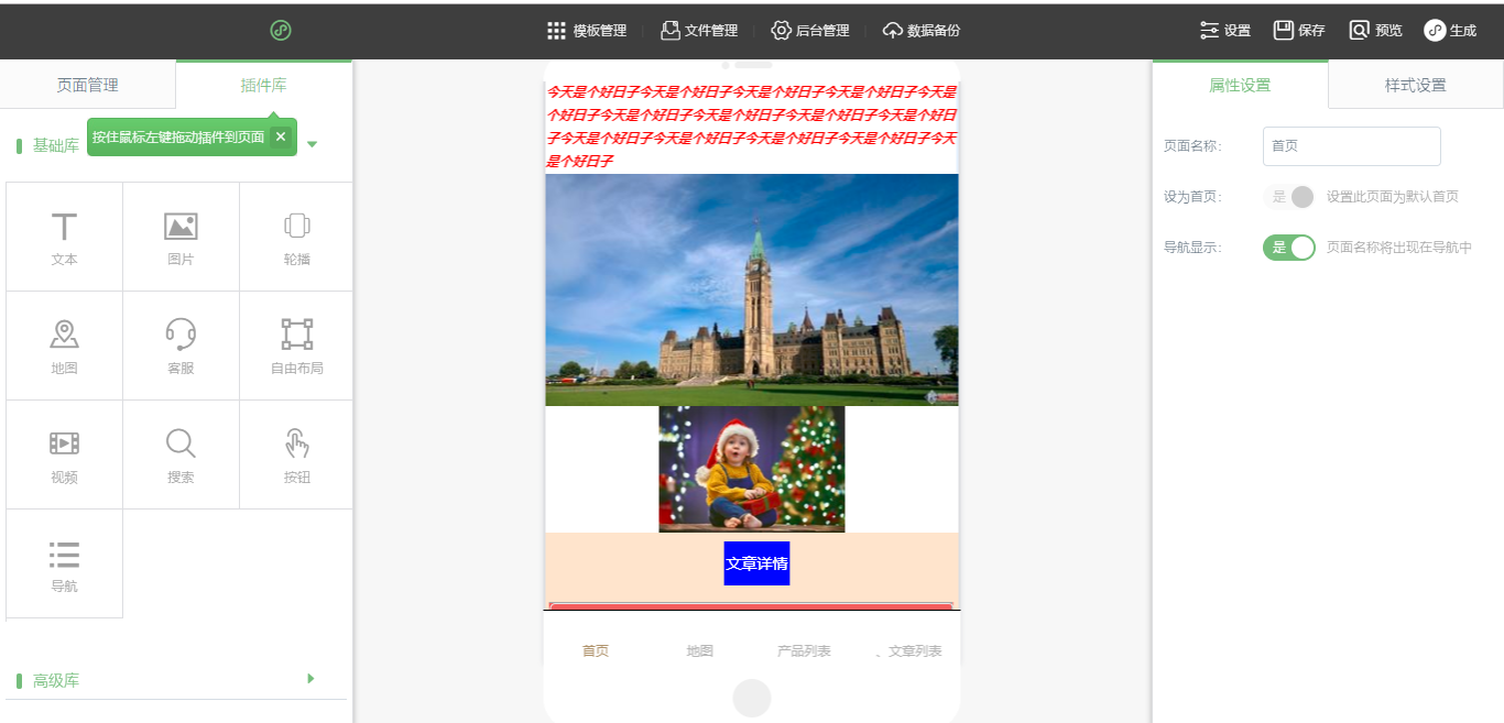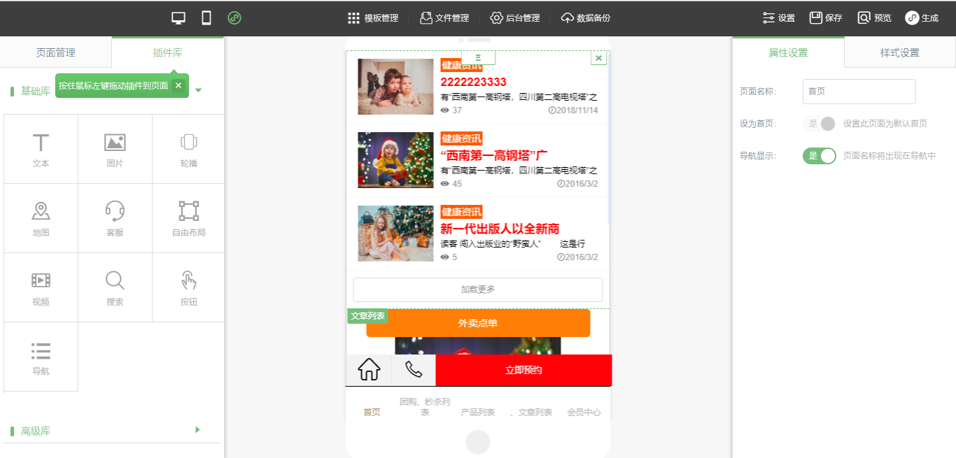 1.在編輯器中,將需要的插件拖入到編輯器中,點(diǎn)擊保存,然后點(diǎn)擊生成,選擇“支付寶”,并點(diǎn)擊下載即可,其他操作方式與“支付寶小程序標(biāo)準(zhǔn)版”一致,這里不做贅述,如圖所示: