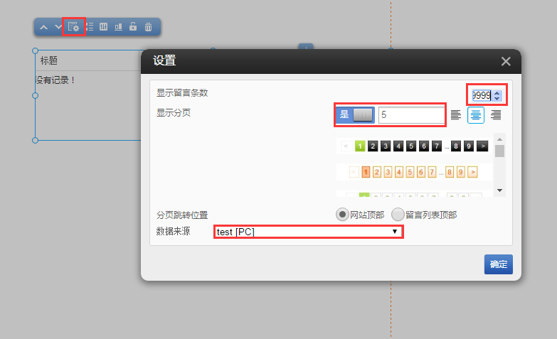 3,點(diǎn)開(kāi)設(shè)置按鈕,選擇是否開(kāi)啟分頁(yè),開(kāi)啟分頁(yè)后設(shè)置每一頁(yè)顯示的條數(shù),選擇留言數(shù)據(jù)來(lái)源。