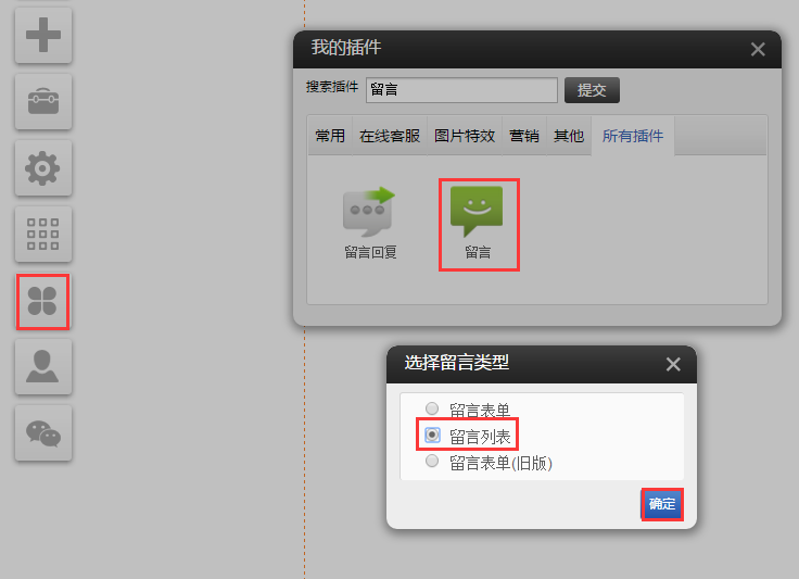 1,在插件中搜索留言,選擇【留言列表】插件,放置在頁(yè)面中。