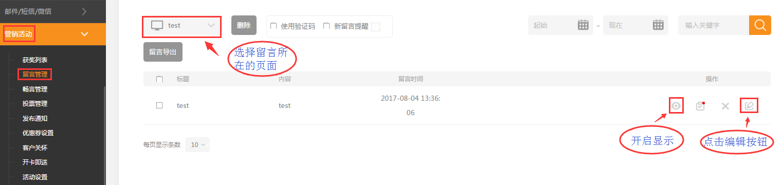 4,在后臺(tái)管理→-營(yíng)銷(xiāo)活動(dòng)→留言管理中,選擇留言插件所在頁(yè)面,找到對(duì)應(yīng)的留言,開(kāi)啟留言顯示,并點(diǎn)擊【編輯】按鈕。