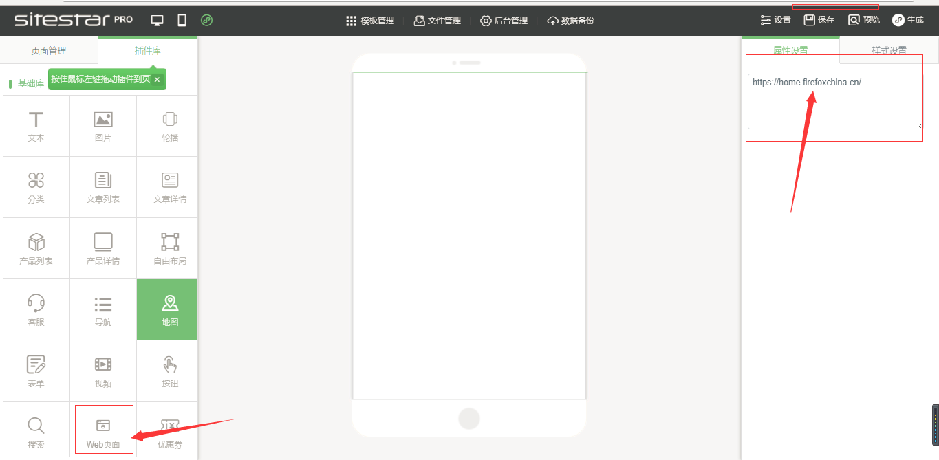 ①.編輯小程序,拖入Web-view插件,在“屬性設(shè)置”中,輸入網(wǎng)址鏈接,(網(wǎng)頁鏈接僅支持Https,個(gè)人類型和海外類型的暫不支持,并且需要配置業(yè)務(wù)域名(web頁面所用域名必須和業(yè)務(wù)域名一致)。