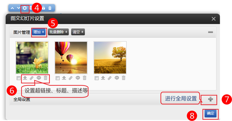 二、點擊設(shè)置,添加需要的圖片、設(shè)置超鏈接、標題、描述等。