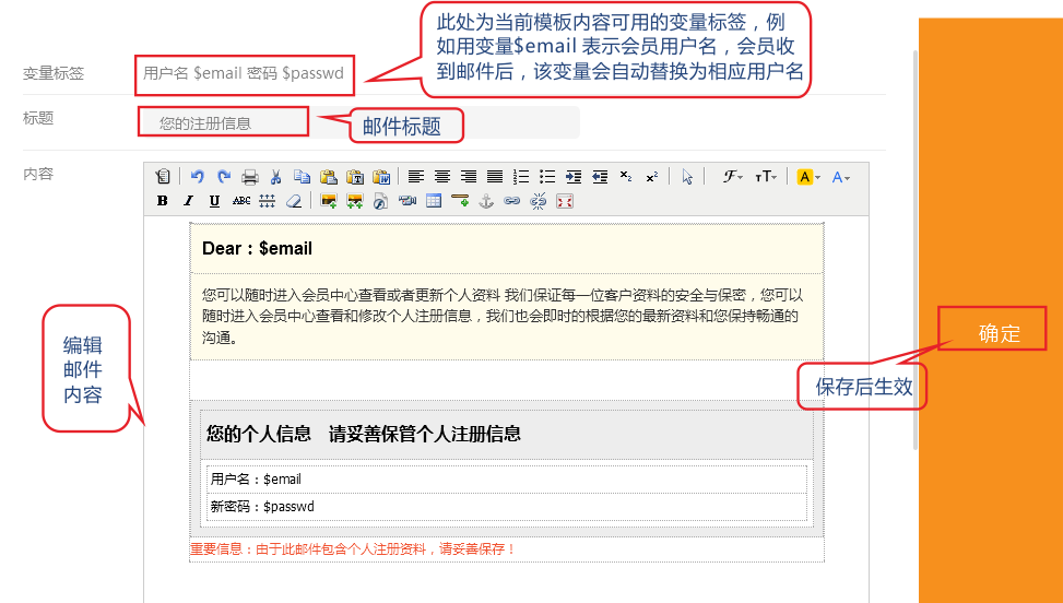 為方便用戶的使用,系統(tǒng)內(nèi)置了常用的電子郵件。店主只需簡(jiǎn)單編輯,就可以直接使用。