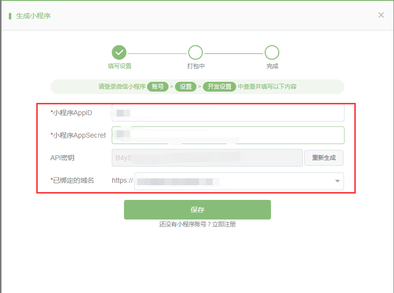 填入小程序AppID,AppSecret,api密鑰,綁定域名。