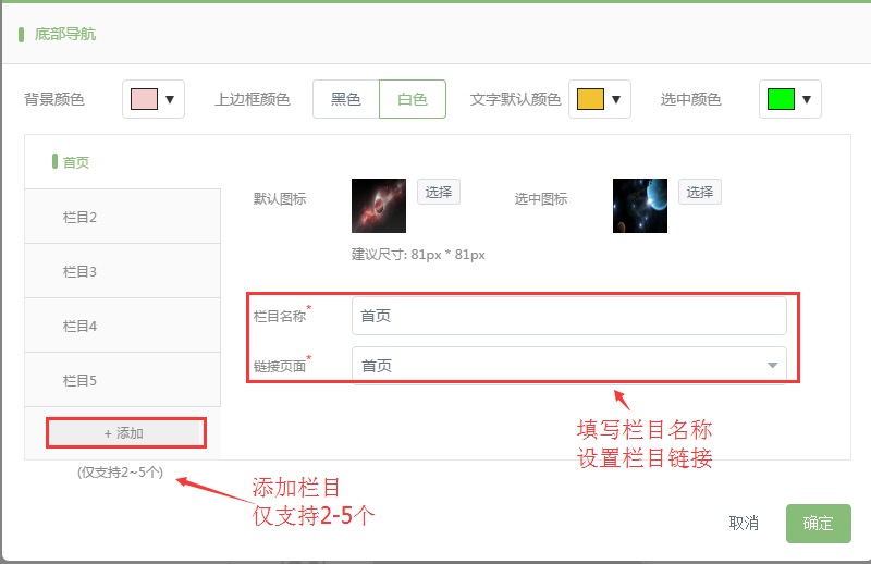 點擊添加按鈕,添加欄目,僅支持2-5個欄目,然后填寫欄目名稱,選擇欄目鏈接的頁面,點擊確定按鈕。