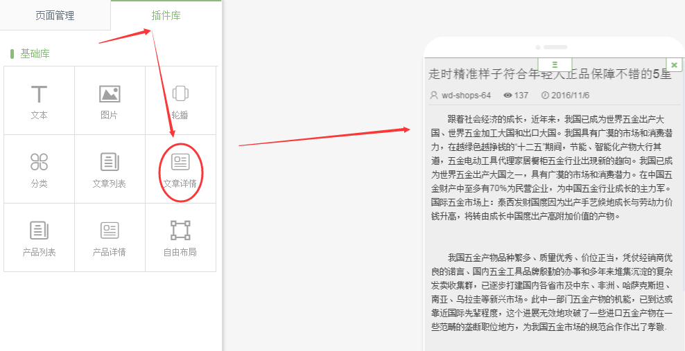插件庫中,將文章詳情拖拽到頁面中