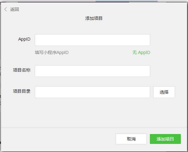 ③.添加項目,填寫AppId和項目名稱。項目目錄選擇解壓過的小程序文件