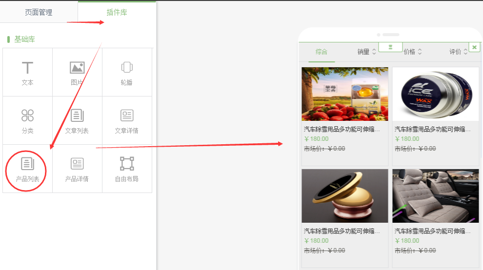 插件庫中,將產(chǎn)品列表拖拽到頁面中