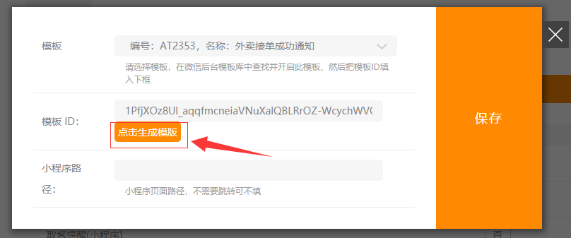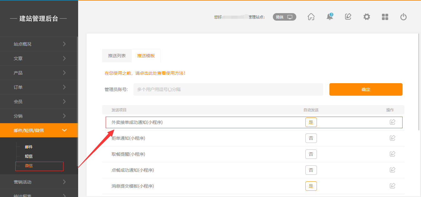 1.后臺(tái)點(diǎn)擊“郵件/短信/微信”-“微信”,選擇推送模板-外賣接單成功通知,點(diǎn)擊編輯-“點(diǎn)擊生成模板”,然后點(diǎn)擊確認(rèn),開啟自動(dòng)發(fā)送即可,如圖所示:
