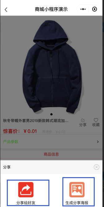 1. 在小程序編輯器-產(chǎn)品詳情中,點(diǎn)擊“屬性設(shè)置”選擇“分享”,則可將該商品制作為海報(bào)進(jìn)行分享,客戶掃碼后即可進(jìn)入到該商品的產(chǎn)品詳情頁(yè)中,如圖所示: