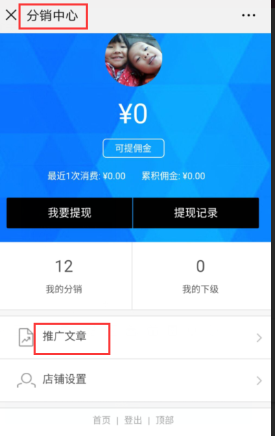 3.微信商進入會員-》分銷中心-》點擊推廣文章進行推廣(一般分享到朋友圈或轉發(fā)給好友)