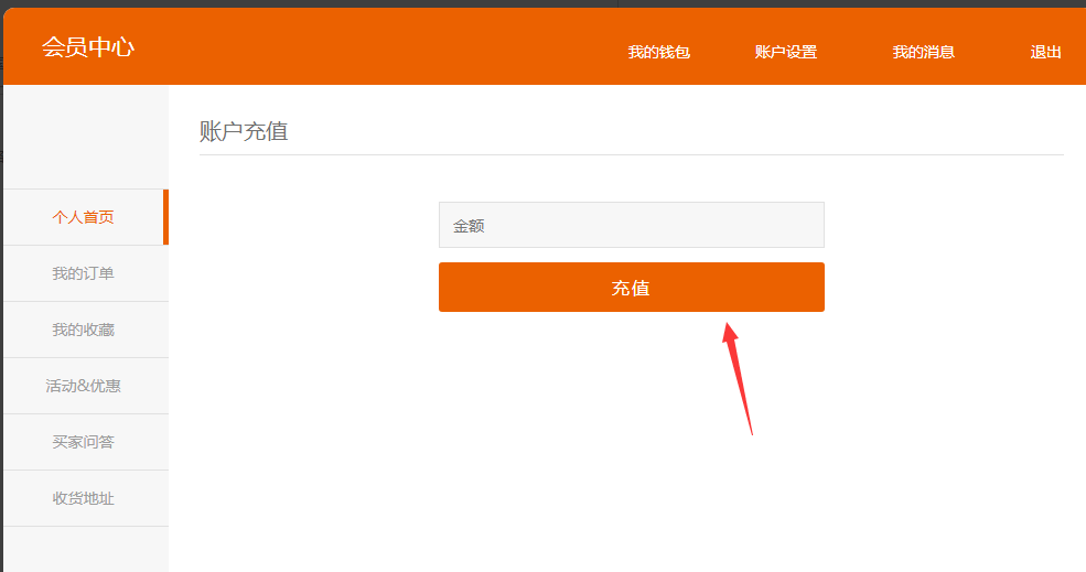 ③.開啟之后,前臺(tái)會(huì)員才可以看到充值入口。以pc為例,進(jìn)入會(huì)員中心---我的錢包增加了賬戶充值和充值記錄
