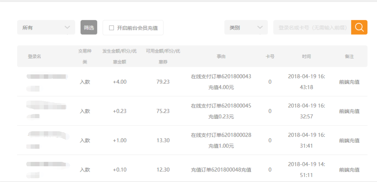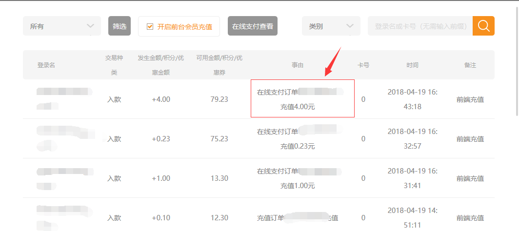 ⑦.在后臺(tái)會(huì)員交易中,可以看到所有支付成功的訂單(后臺(tái)充值和前臺(tái)充值),為了區(qū)分訂單,在事由中有描述,如下圖: