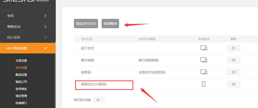 ①.后臺(tái)---電子商務(wù)設(shè)置--支付設(shè)置里,可以添加支付方式。微信支付指的是前臺(tái)生成填寫(xiě)的設(shè)置,這里會(huì)同步前臺(tái)的填寫(xiě)內(nèi)容