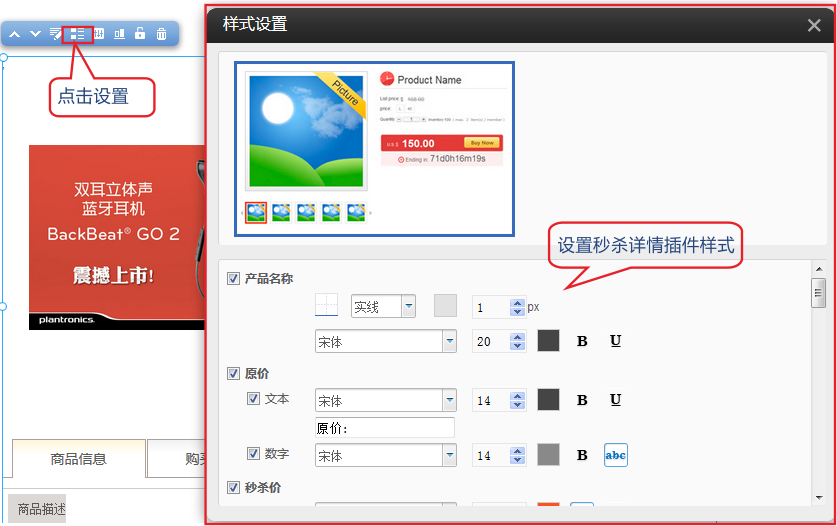 3,建立新頁面后,在此新頁面將“插件”里面的“秒殺插件”拖動出來,系統(tǒng)再次彈出以下選擇框:
