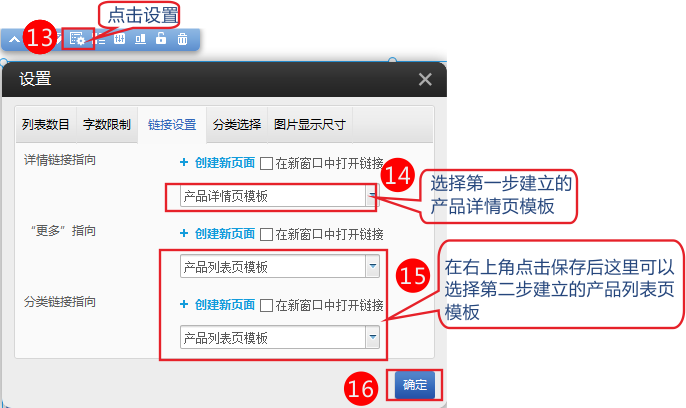 4,模塊上方點擊設(shè)置-鏈接設(shè)置。設(shè)置詳情鏈接和更多指向 分類鏈接指向。