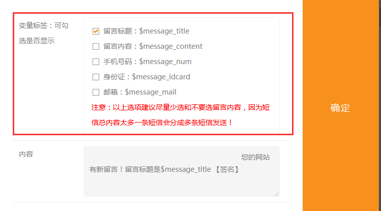 1、后臺----短信模板中,增加了【留言內(nèi)容】模板,開啟此模板
