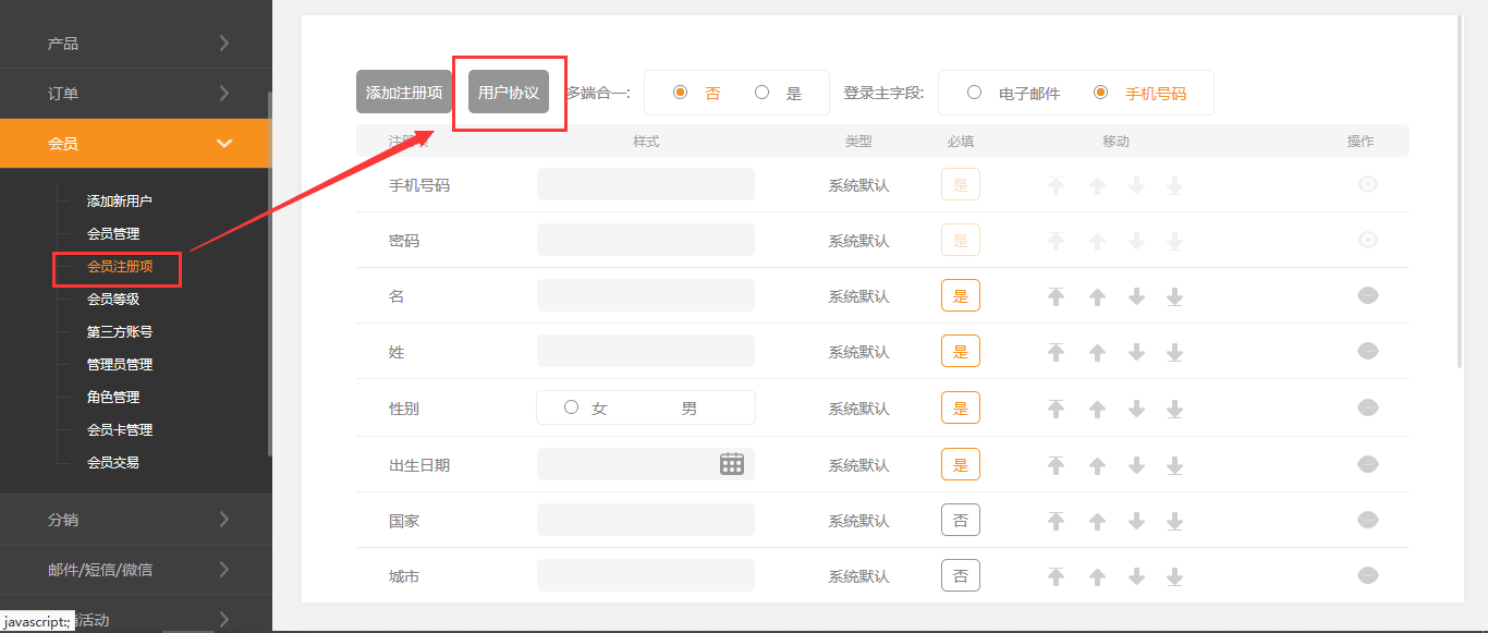 1,在后臺管理-會員-會員注冊項-用戶協(xié)議中,開啟協(xié)議。