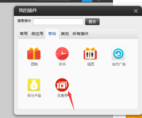 ②.在插件--營銷里面,選擇優(yōu)惠券插件