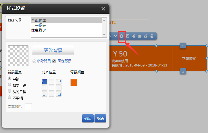 ③.點擊設(shè)置,數(shù)據(jù)來源可以選擇指定的優(yōu)惠券,并且可以設(shè)置優(yōu)惠券插件的樣式