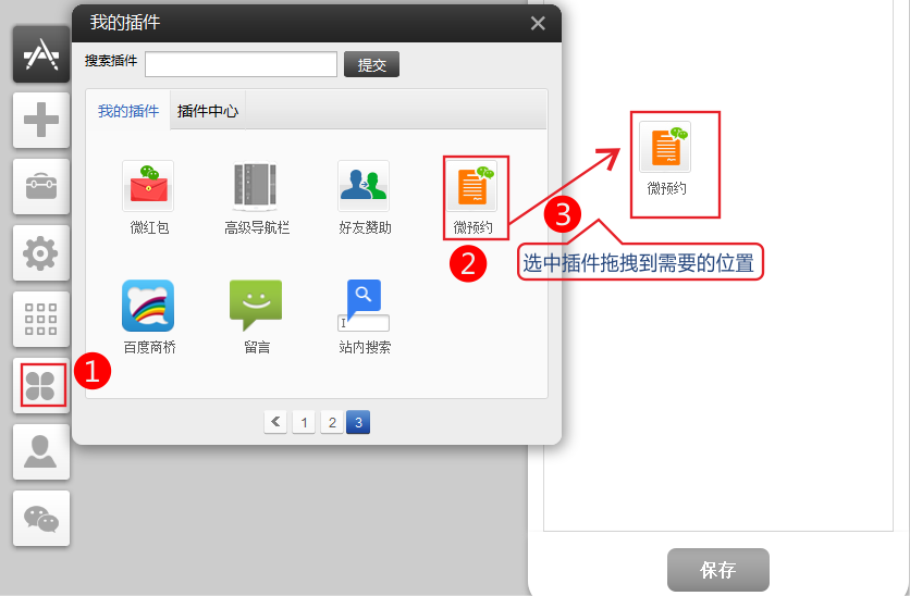 6.從左側(cè)的工具欄插件中,選中微預(yù)約插件后按住左鍵不放,然后把微預(yù)約插件拖拽到您需要的位置。(要使用該插件需要您先在插件中心啟用