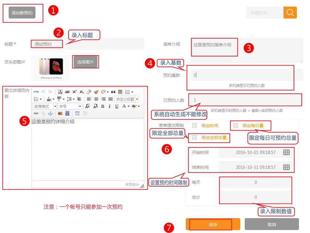 后臺(tái):可以添加多個(gè)預(yù)約活動(dòng),自由編輯預(yù)約表單內(nèi)容,控制預(yù)約預(yù)約表單限制條件(限定時(shí)間,限定每日量,限定全部總量),查看預(yù)約結(jié)果