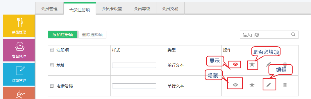 如果想讓某個注冊項在會員中心顯示,點擊變?yōu)榧t色眼睛圖標(biāo)就可以了;不顯示就點擊變?yōu)榛疑劬D標(biāo)。