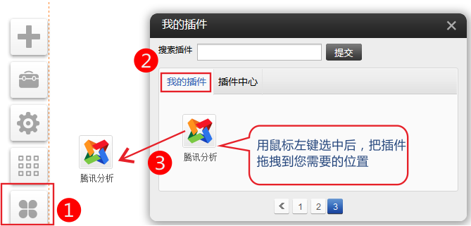 2,依次點(diǎn)擊插件-我的插件-選中“騰訊分析”插件拖拽到您需要的位置。(如果“我的插件”中沒有,請(qǐng)到插件中心選啟用)