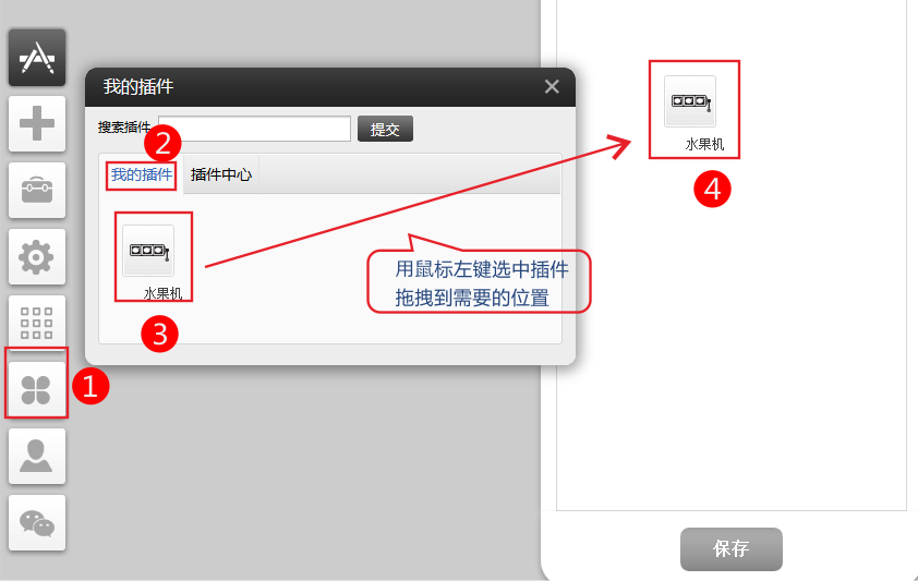 三、依次點(diǎn)擊插件-我的插件-選中“水果機(jī)”插件拖拽到您需要的位置。(如果“我的插件”中沒有,請到插件中心選啟用)