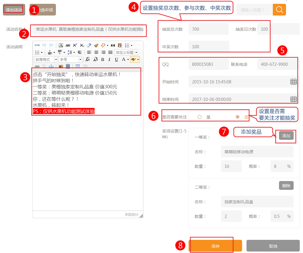 2、后臺(tái)可以設(shè)置中獎(jiǎng)概率已經(jīng)抽獎(jiǎng)個(gè)數(shù)