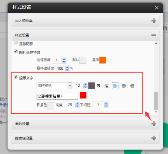 ⑦.點(diǎn)擊結(jié)果插件的樣式設(shè)置,可以設(shè)置樣式。和產(chǎn)品列表一樣,可以選擇加入購(gòu)物車等